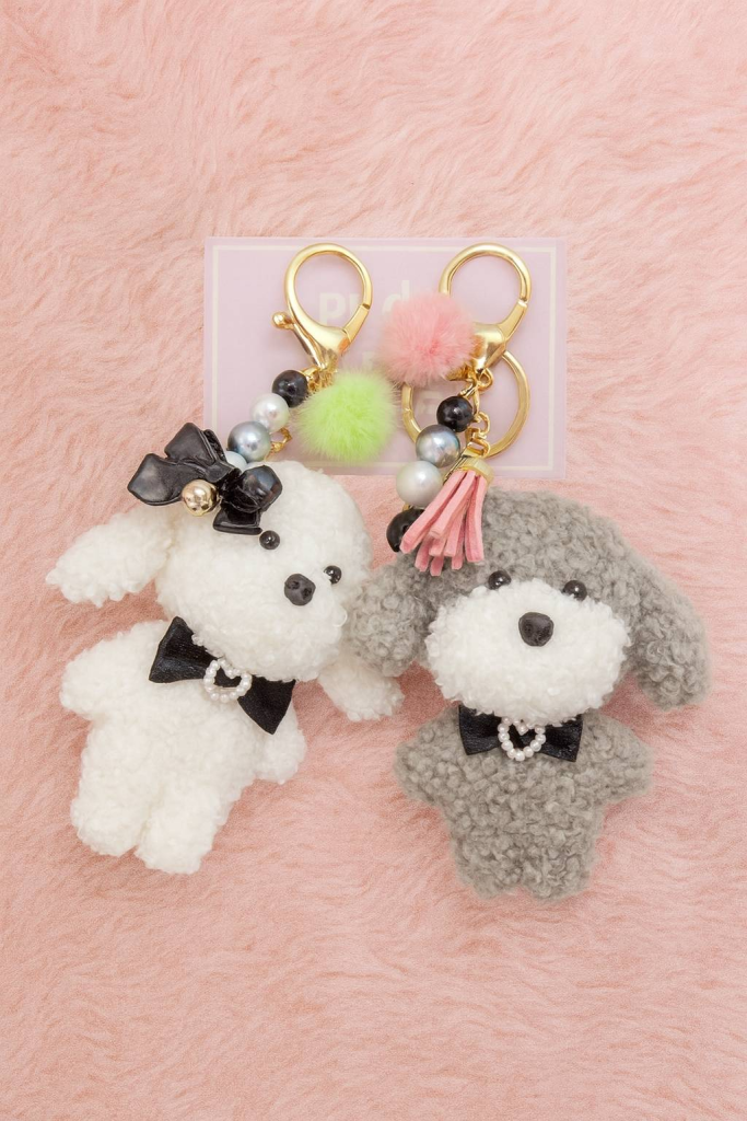 プードルファーのもこもこ小物、 キーチャームやぬいぐるみ、 樹脂粘土のアクセサリーなど、 さまざまな素材でプードルを表現しています。